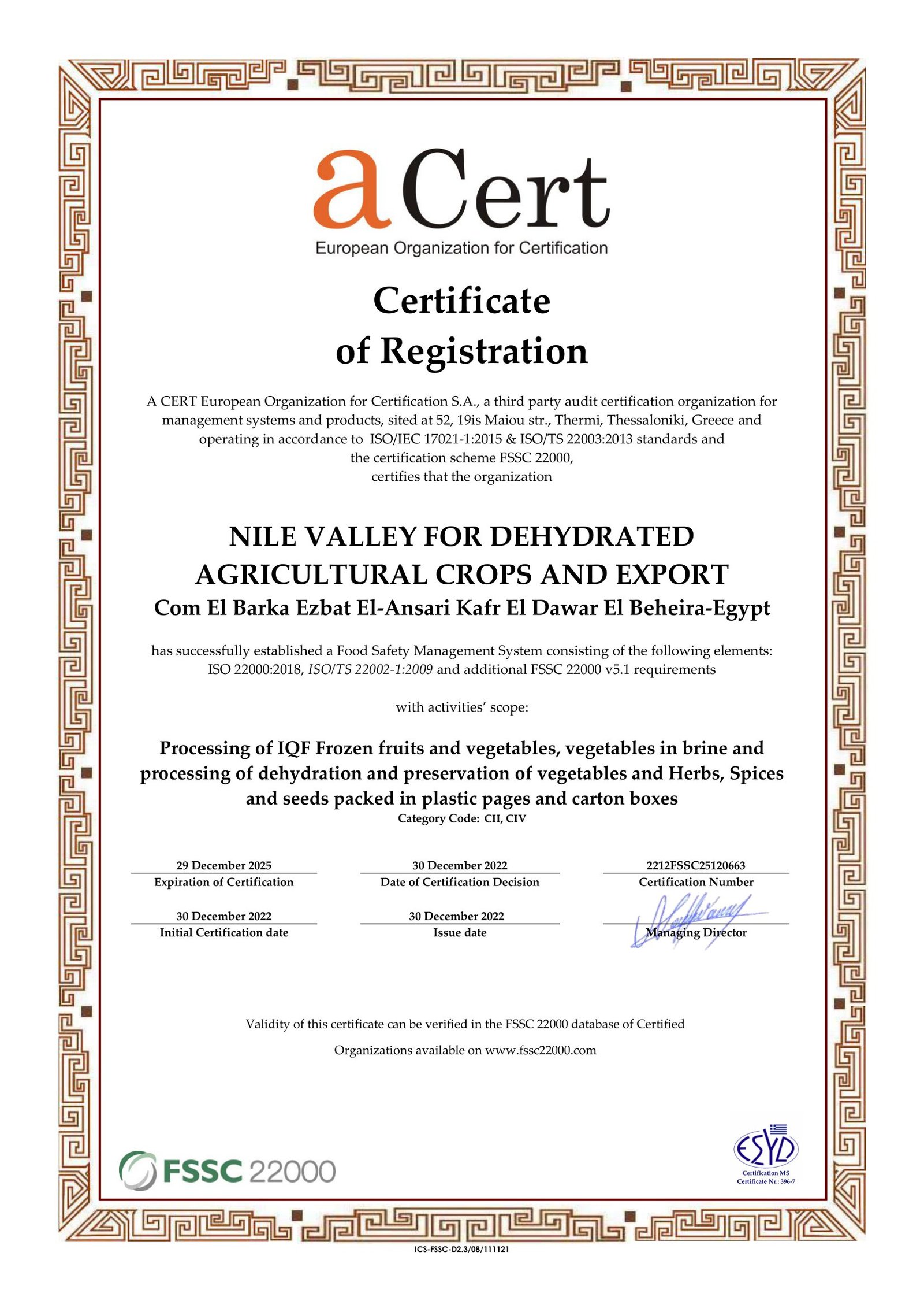 9001/2000, – HACCP, – ISO 18001, – ISO 22000, – FDA